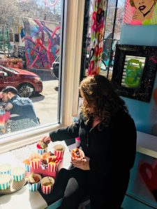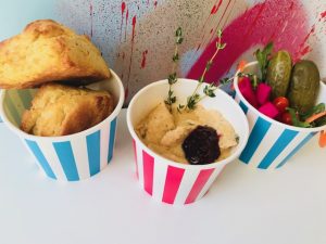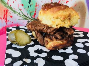 intense aroma of the braised brisket cooking; it was a mouthwatering sensory experience that you will want to have! Everything here is good, and that’s not just because this is a review. I really was impressed with each and everything I tasted, which was more than half the menu. You can order a meal here and have leftovers to take home, which they will provide you with an adorably decorated cake box to take your meal home in. Besides the decor, charming service, and menu options, some of the favorite dishes I tasted were the Braised Brisket with au jus and orange shallot marmalade. Here Wesley put it on his famous Cloud Biscuits for me, which are insanely addicting and unlike any biscuit I have tasted before. On top of that Pinky’s Space also offers Roasted Turkey Breast with