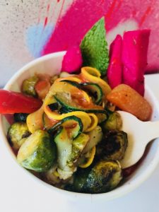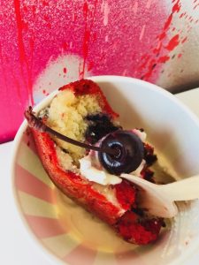 veloute, lingonberry jam and watercress, Sausage & Thyme Country Gravy with fresh apple, and Space Cake, which is a cosmic confection of red velvet, brownie, and banana yogurt cake with chocolate chunks and cherries. If you’re vegetarian and want to enjoy something amazing, they also make a vegetable spiral salad and my favorite, the Kabuki’s Jamaican Curry Couscous, with baby Brussel sprouts, seasonal vegetables, and dried apricots.