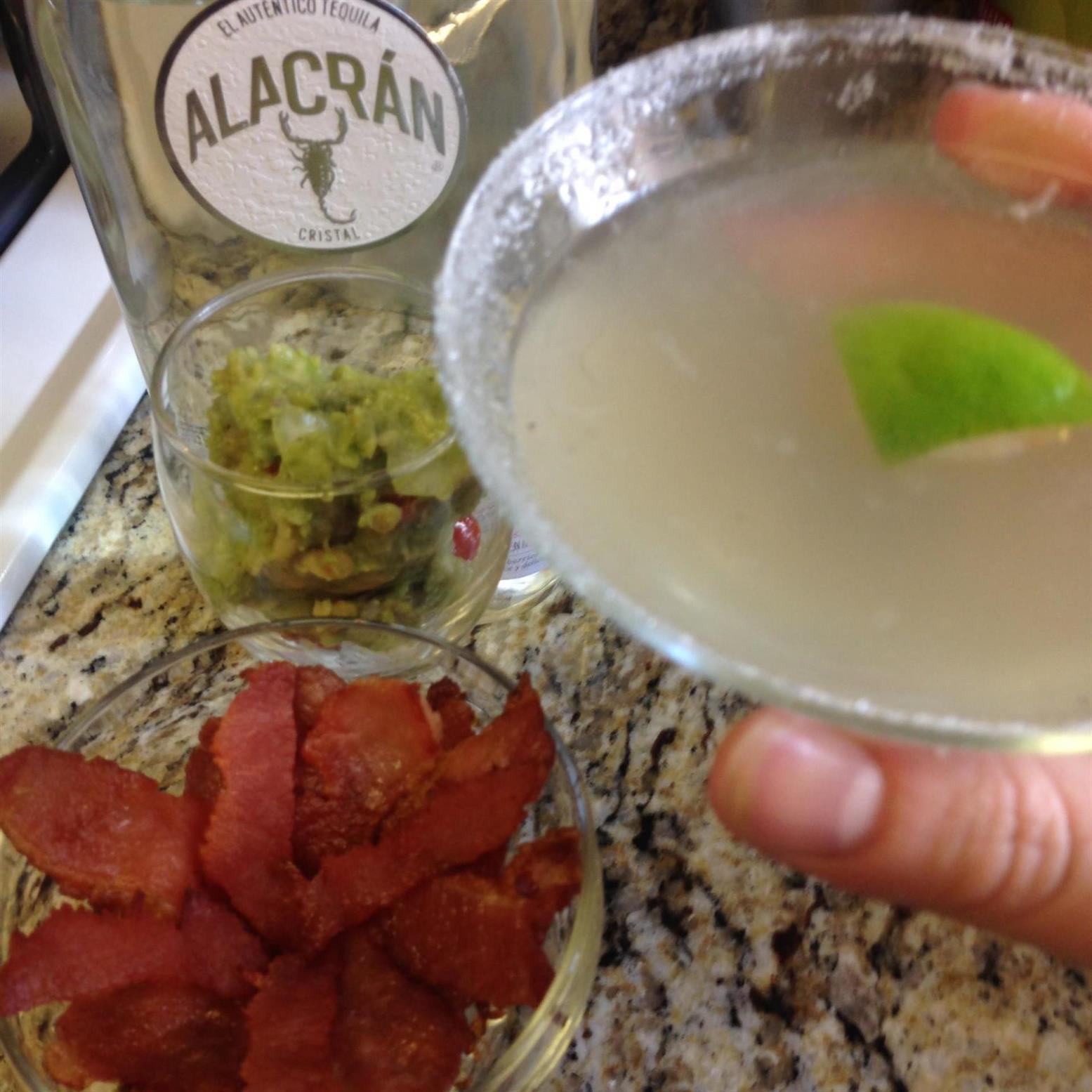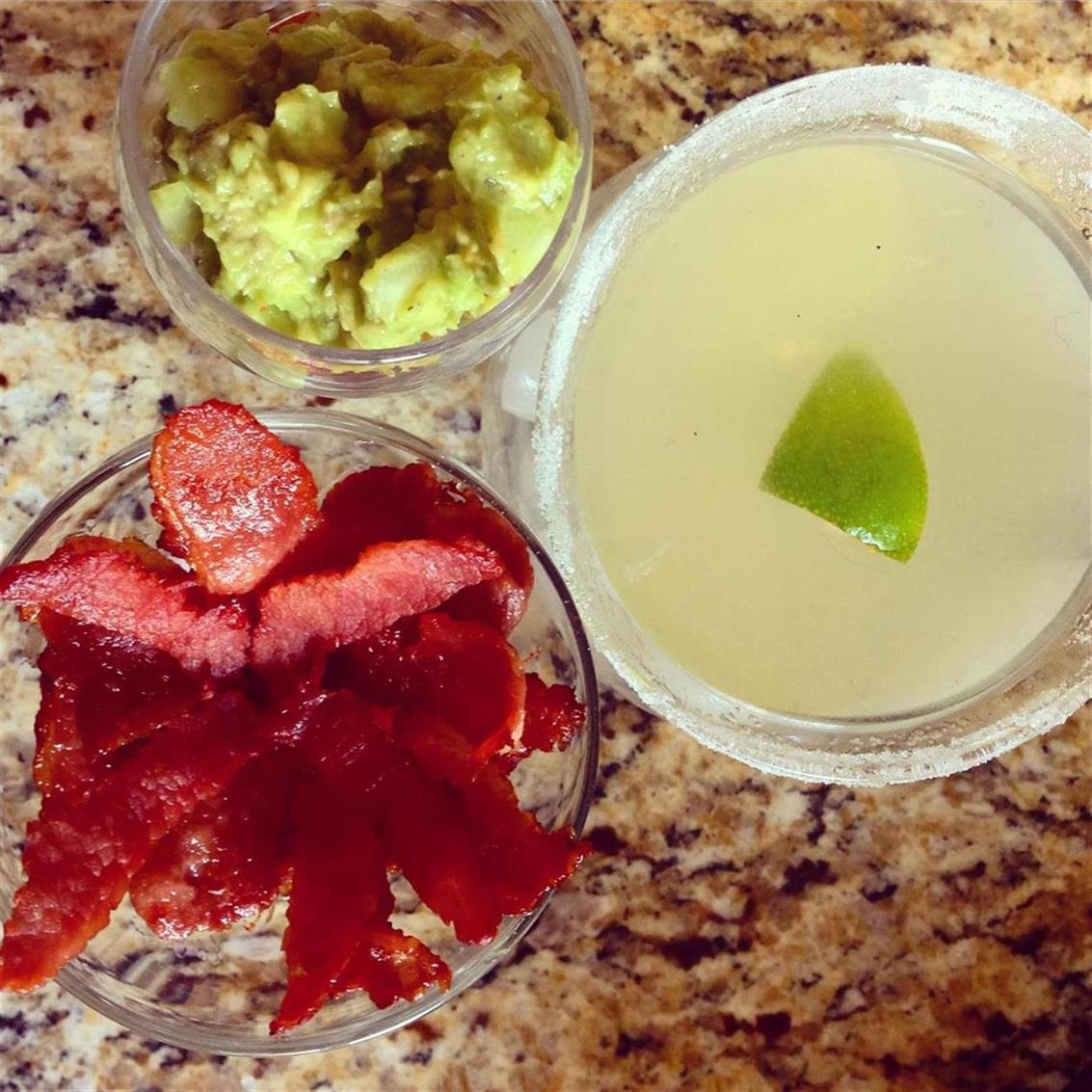Bacon Chips: On a baking sheet lined with parchment, oven heated to 400 degrees, take the bacon strips and cut them into 2 inch squares (they will shrink). Bake for 10 minutes until nice and crispy. Remove and let cool. Dip into Guacamole and sip that margarita!