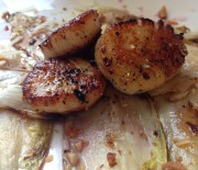 - Lay the endives on the plate, top with scallops in the center, drizzle on some of the dressing, sprinkle the nuts and cheese, and taste!