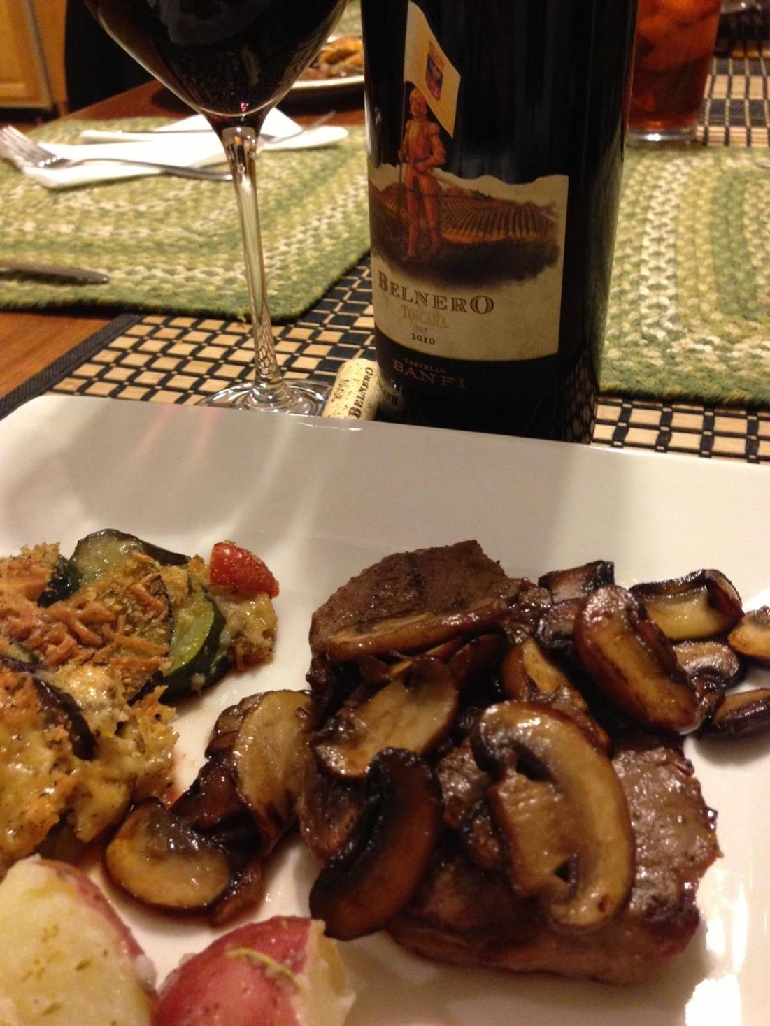 The wine I had was the Castello Banfi BelnerO Toscana IGT 2010 paired with fillet mignon, sautéed garlic butter mushrooms, roasted herb potatoes, and Italian vegetable au gratin.