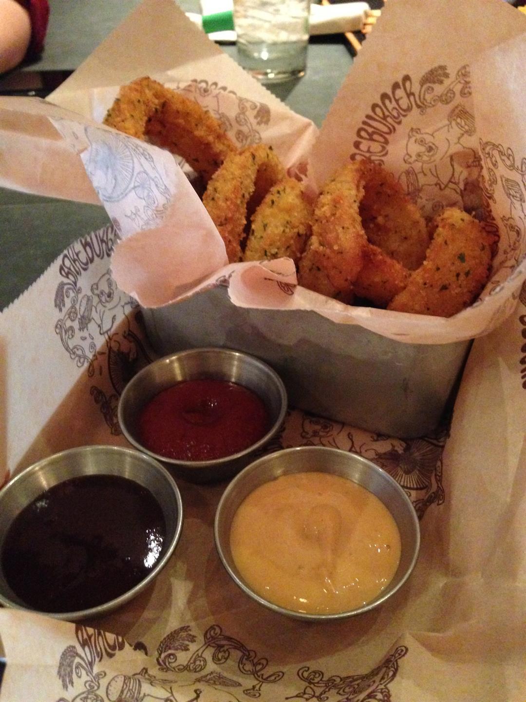 onion rings you will ever have. The Mediterranean Burger comes out of the kitchen sizzling hot and is cooled off by a house made creamy yogurt sauce. This lamb burger is topped with fresh cucumbers, tomato, red onion, and lettuce. Alongside are the Onion Rings accompanied by three dipping sauces, which are out of this world yum! The Curry Ketchup is unique and tangy with some slight spice. The BBQ is sweet and perfect with the seasoning on the onions. The “Special Sauce” is worth buying extra just so you can take it home and dip all your favorite foods into it.