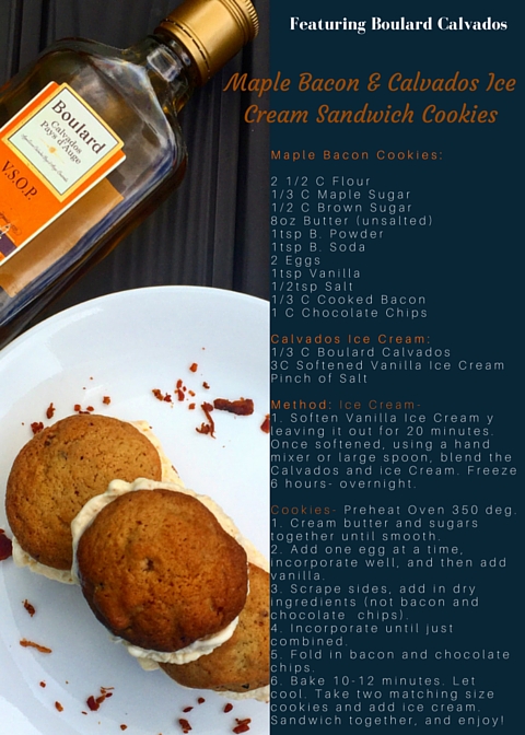 Get ready for it… Maple Bacon Chocolate Chip Cookie Calvados Ice Cream Sandwiches. They are easy to make, delectable, and a mouthful to say (and eat) literally! Using Calvados Boulard VSOP, which is a Calvados from Pays d’Auge, France. It is made from ciders which are produced in the geographical area of Pays d’Auge, which is included in the Appellation d’Origine Contrôlée Calvados zone. Calvados Boulard VSOP is produced with blendings of different Calvados Pays d’Auge of minimum 4 years age.