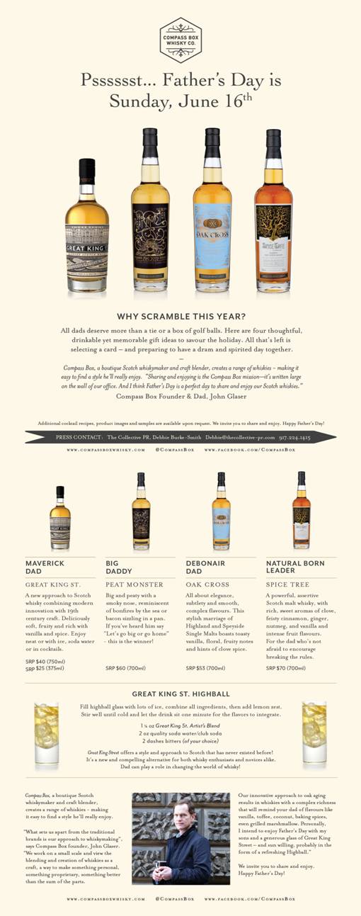 Thinking of what to get Dad this year? Father’s day is right around the corner and if you’re over buying him another shirt or tie, why not get him something a little different on his special day. Is your father the kind of man who likes to come home after a long day at work and enjoy a nice glass of Whisky? Maybe a cigar, to go along for the smooth ride? If yes, then Compass Box Scotch Whisky can be your go-to gift choice this year! Dad can enjoy this gift year round by himself or with friends and since the bottles are beautiful he can display it for show.