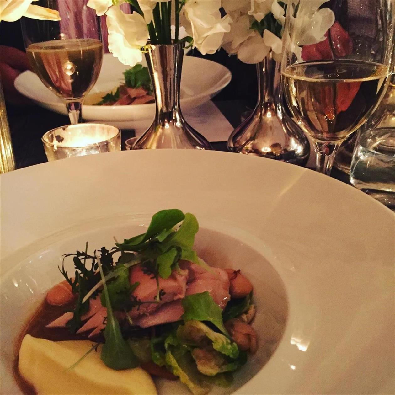 I was seated at the silver table, which was fun and unique and featured a menu with white wines, fish, meat, and sweets. A second course of Pennsylvania Chicken baked with Alfalfa and Clover Hay accompanied by Organic Butter Beans, Brussels Sprouts, and Napa Cabbage was enjoyed and paired with a 2012 Smaragd, Dürnsteiner Kellerberg, FX Pichler. The wine was a rare Austrian wine and when paired with the chicken, it was quite the perfect pairing. We were not blindfolded the entire dinner, so I was able to enjoy the beautiful plating and exquisite pairings for the second and third courses.