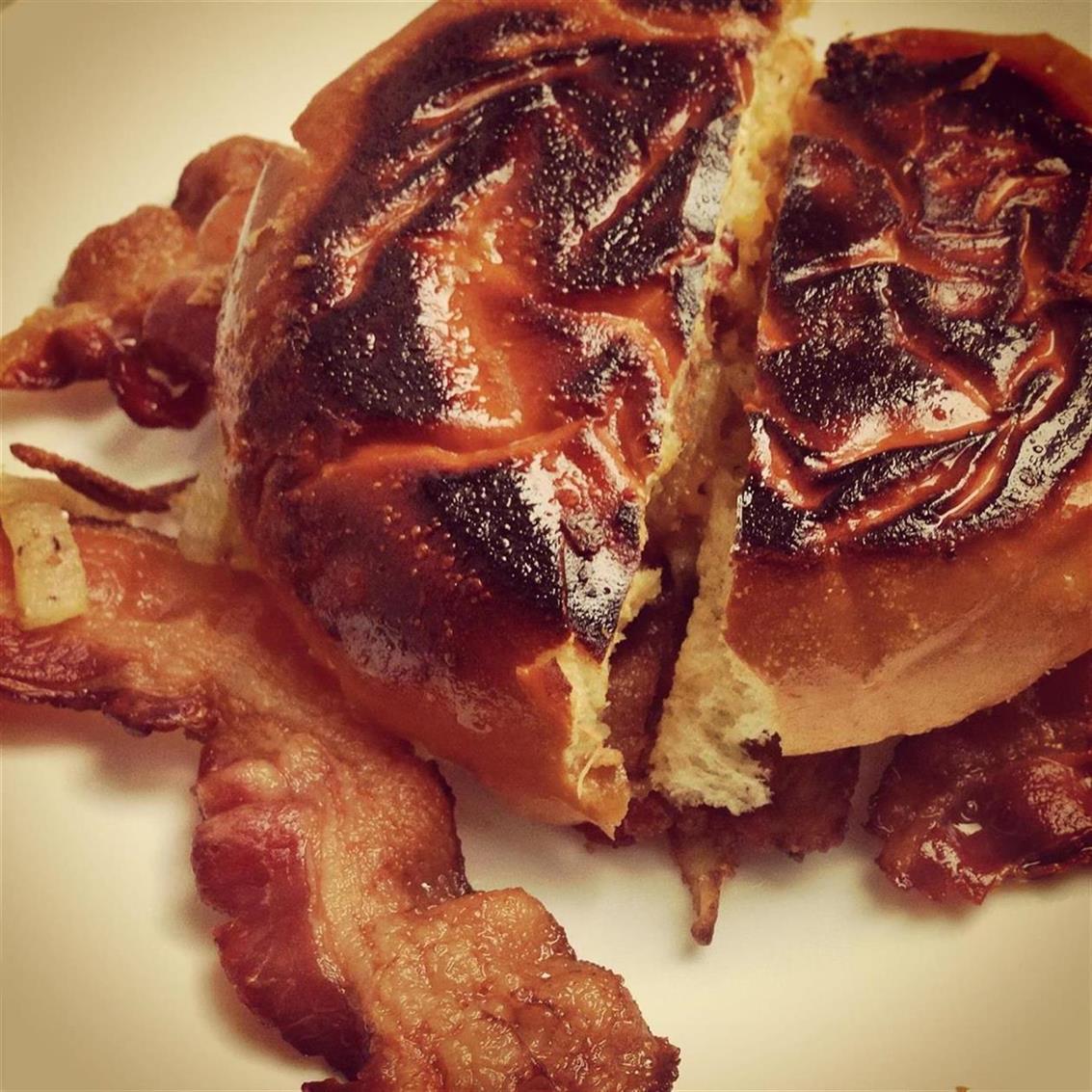 The Bolla Chianti I enjoyed with this Bacon Lover’s Grilled Cheese. Toasted Brioche Bun topped with Cheddar Cheese, Bacon, and Crispy Onions. Spread on a Bacon Tomato Jam and you’re set for one incredible pairing!