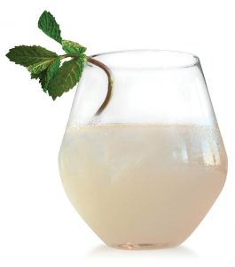 Method: Add all ingredients in a shaker with ice. Shake hard, and pour into a stemless wine glass. Garnish with mint sprig.