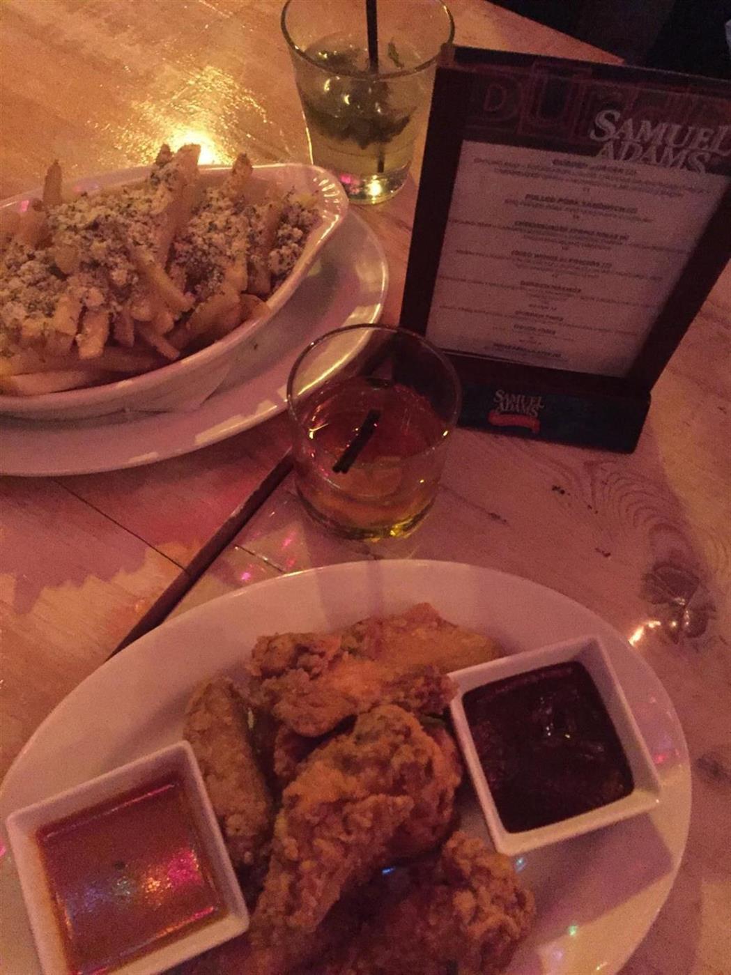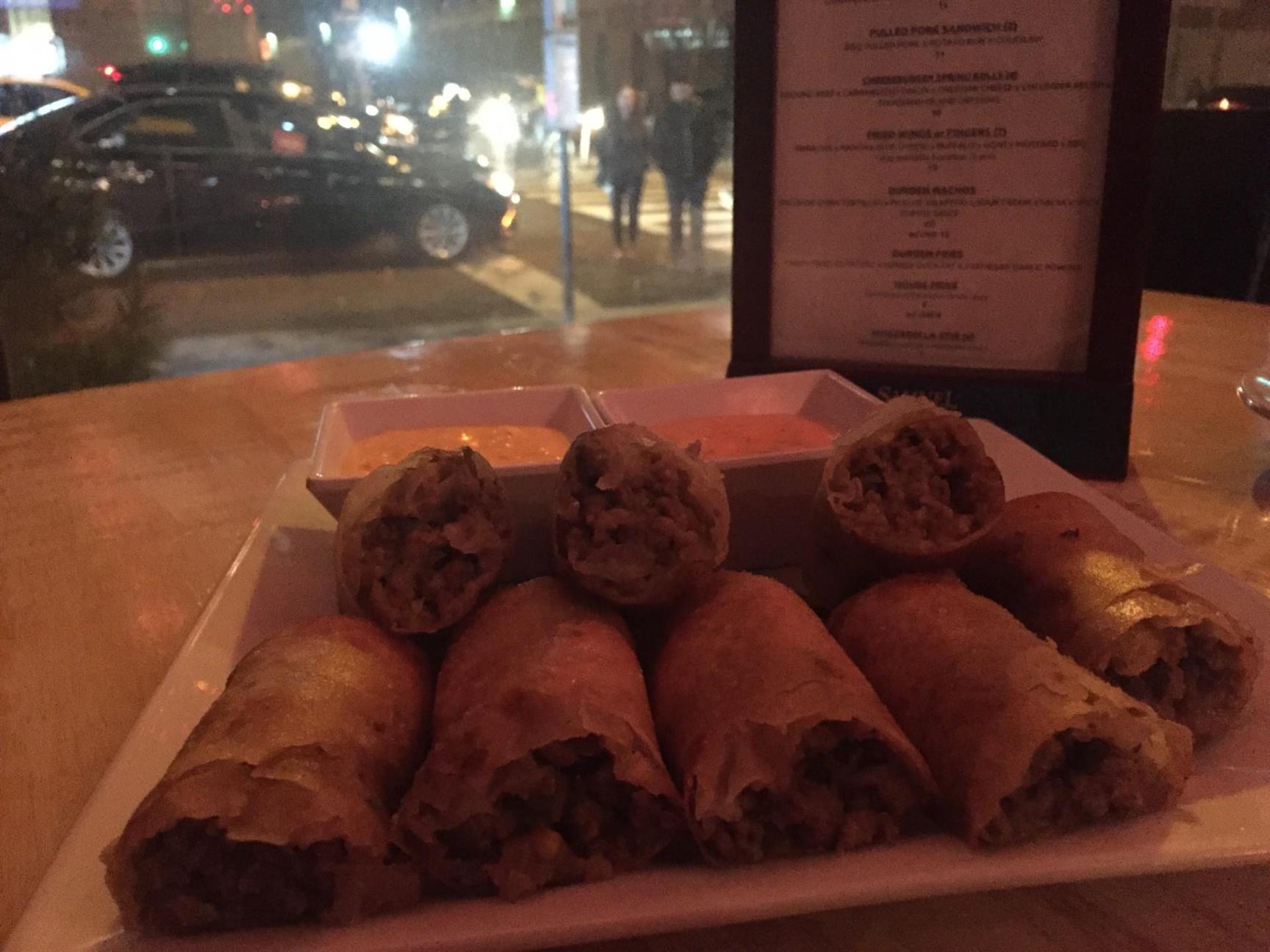 IMG_3771A small menu with plenty of variety sits on each table and the bar. Craft beers, cocktails, and some wines make up the drink menu, with a fully stocked bar. I enjoyed a whiskey cocktail with some Fried Chicken Wings, Cheeseburger Spring Rolls, and Parmesan Fries. The wings were a pleasant surprise because unlike traditional buffalo wings, where they are tossed in sauce and one flavor, Durden does it differently by supplying dipping sauces. I had the choice between Buffalo and BBQ for my plate of wings, and was pleasantly surprised by how much I enjoyed the option to dip. The chicken was fried perfectly, not greasy, and the sauces coated the crispy fried batter beautifully.