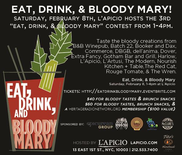 Saturday, February 8th 2014 will be the 3rd annual Eat, Drink, & Bloody Mary held at L’Apicio, an Italian-inspired restaurant from Executive Chef Gabe Thompson and Beverage Director Joe Campanale. This hot spot brings modern Italian food to the East Village.