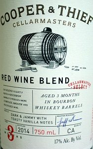 2014 Cooper & Thief Cellarmasters Red Blend: This 2014 blend is from California and aged in bourbon barrels. Composed of syrah, zinfandel, merlot, petit syrah, and cabernet sauvignon, this bold blend spends three months in ex-bourbon barrels and expresses soft tannins and bourbon inspired flavors and aromas.