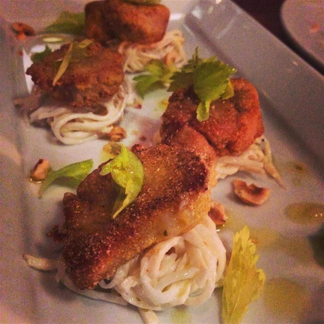These sweetbreads are crispy, tender, and delectable when paired with the Robinot, L’Ange Vin, Fêtembulles, Jasnière, Loire, France, 2010. This Sparkling Chenin Blanc is crisp, beautiful, and so pair-able with anything pan seared or fried!