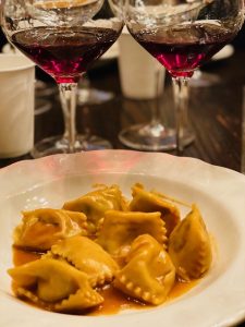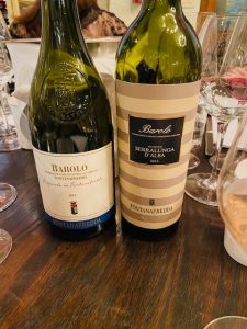 Once we sat down for a delicious lunch, the Barolo’s came out! The first course was Agnolotti del Plin which is handmade pasta with pork and veal, paired with Barolo DOCG Serralunga D’Alba 2015, and Barolo DOCG Fontanafredda 2013. I have had 2015 Serralunga many times and really adore the wine. It’s always a crowd-pleaser because it’s dry with vanilla, spice, and dried roses. It’s a wine that easily pairs well with spring dishes such as Spring Pea Risotto, Leg of Lamb, and Grilled Vegetables. Barolo DOCG 2013 is from the Cru areas of the Nebbiolo vineyards (just in case you didn’t know, Barolo is made from Nebbiolo grapes) where this plot of land has a nice mix of soils, creating an extremely complex and elegant wine.