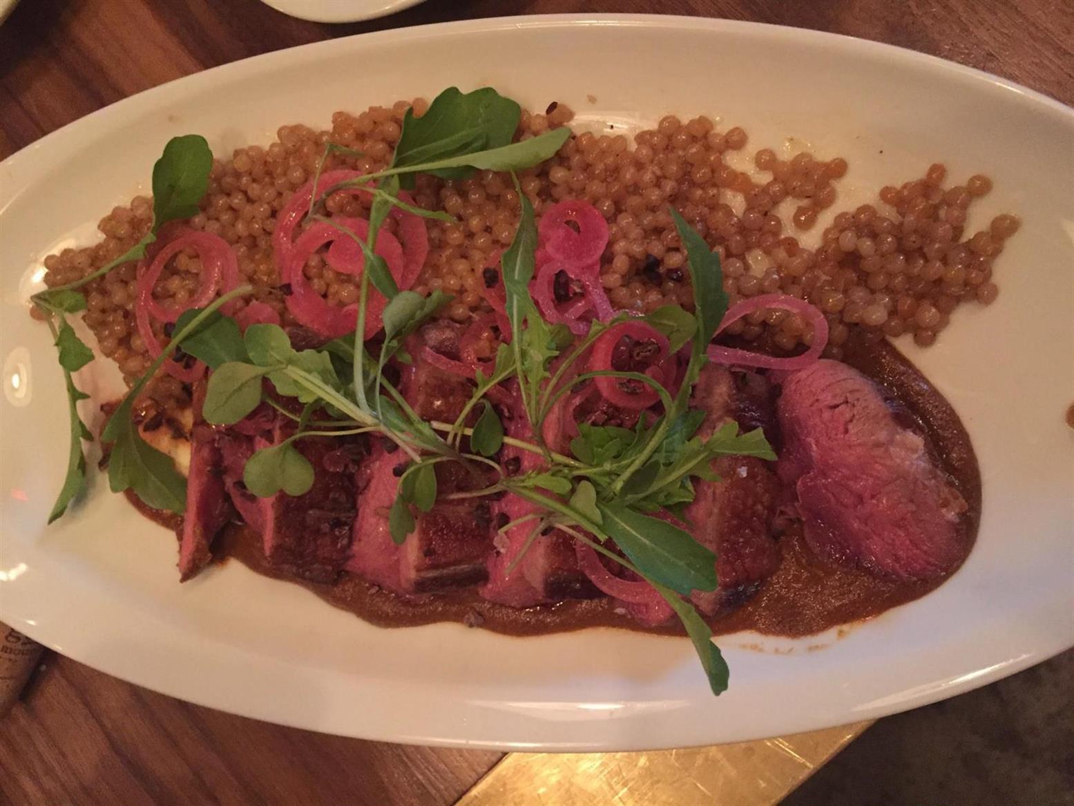 while the Yiron paired beautifully with the Duck. The Yiron is 51% Cabernet Sauvignon, 33% Merlot, 9% Petit Verdot, and 7% Syrah. Aged 16 months in French oak with a blend of grapes that changes annually. The duck really makes the cinnamon spice come out in the wine and when accompanied by Israeli couscous, baharet mole, and pickled red onions, the entire pairing really worked well.