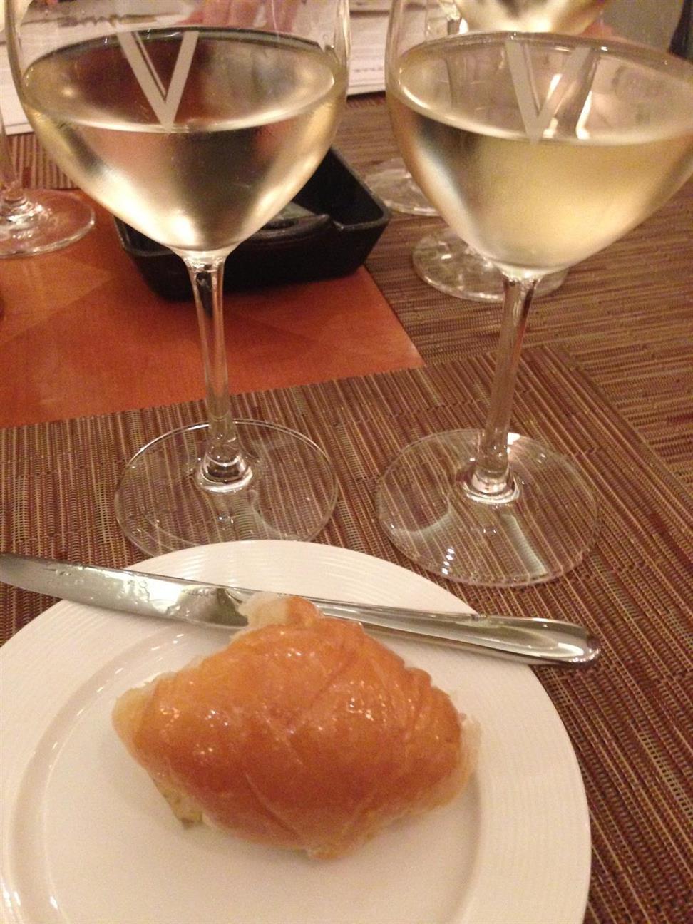 Ranches Sauvignon Blanc. This wine was more of a pleasant pairing to the appetizer than a perfect pairing, but the wine itself on its own was stunning. The nose is full of Lime, Passion Fruit, and Melon with a little vegetal side. On the palate, there is plenty of acidity, followed by more lemongrass and some tropical fruit notes.