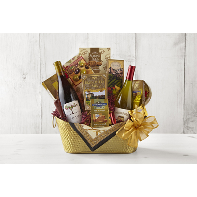 Elegant Gold Highlights: A gift basket that lights up any room and features tasty treats fit for royalty. Our gold tin and elegant fabric liner shows your style and grace. Gift includes: One bottle of Painted Van Chardonnay (California), Cebada Pinot Noir (California), Ghirardelli Milk Chocolate, cheese knife, Ghirardelli Dark Chocolate, water crackers, fruit and nut mix, Almond Roca cookies, marinated olives, cashew roca, and Brie cheese spread delivered in a gold tin and adorned with European-style trim. ($89)