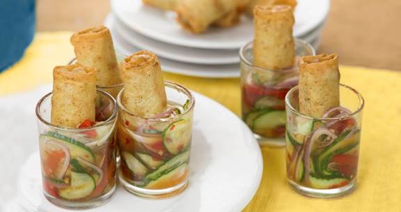 3. While cucumbers are marinating, cook spring rolls according to package directions. Add onion and roasted red pepper to cucumber, stir to combine, and place an equal portion in 8 small shot classes or cups.