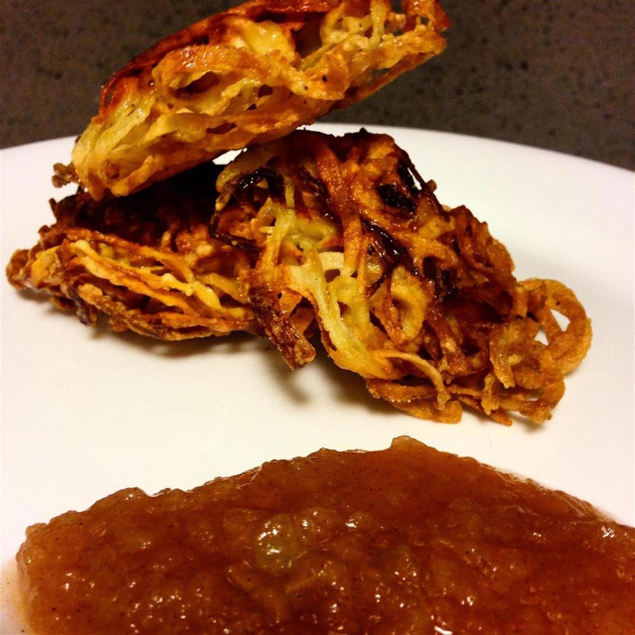 Take 6-8 Granny Smith Apples and throw them in the crock pot with some cinnamon and a splash of water. Let them hang in the crock pot for 4-6 hours, and stir with a spoon. Serve warm or cold with your latkes.