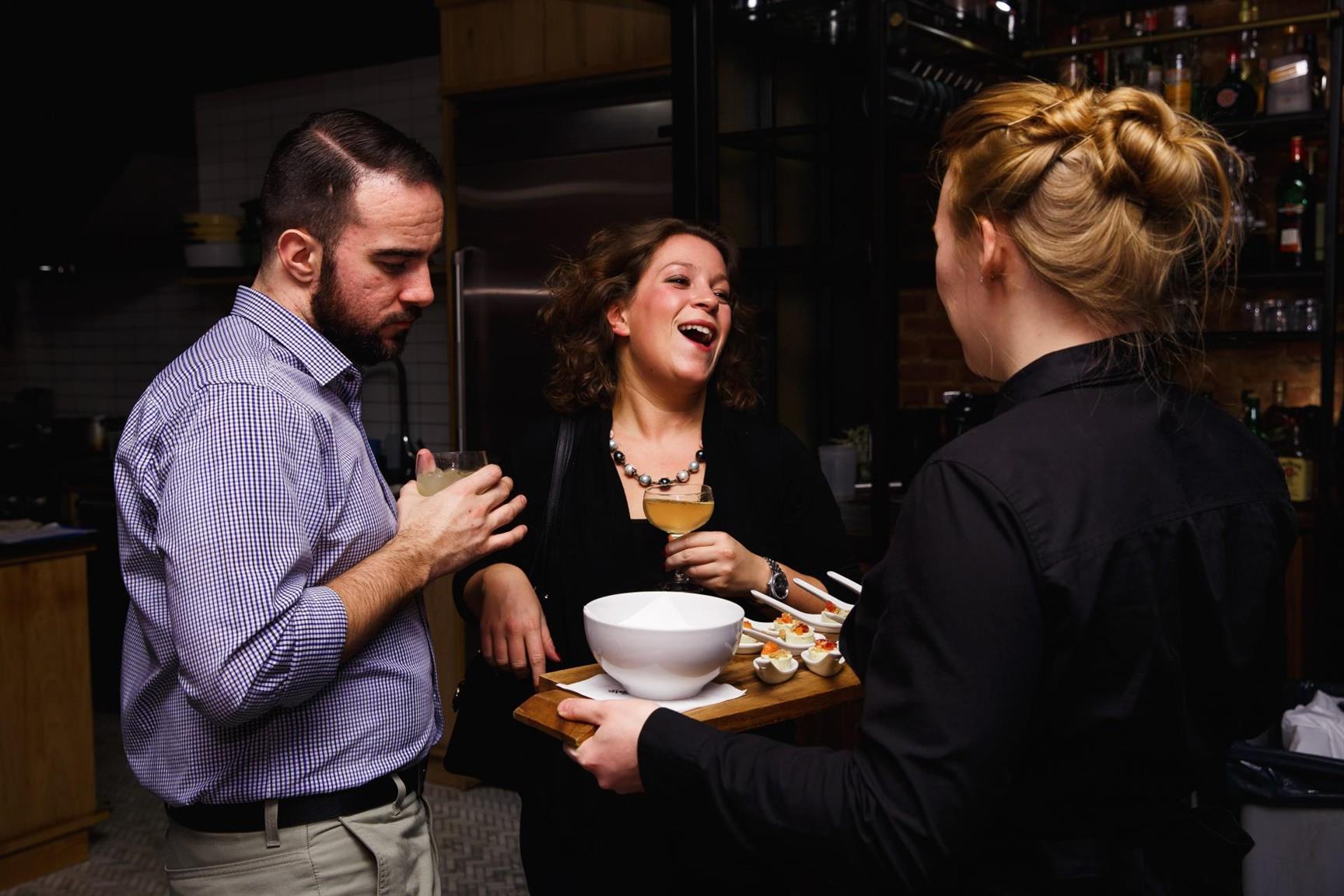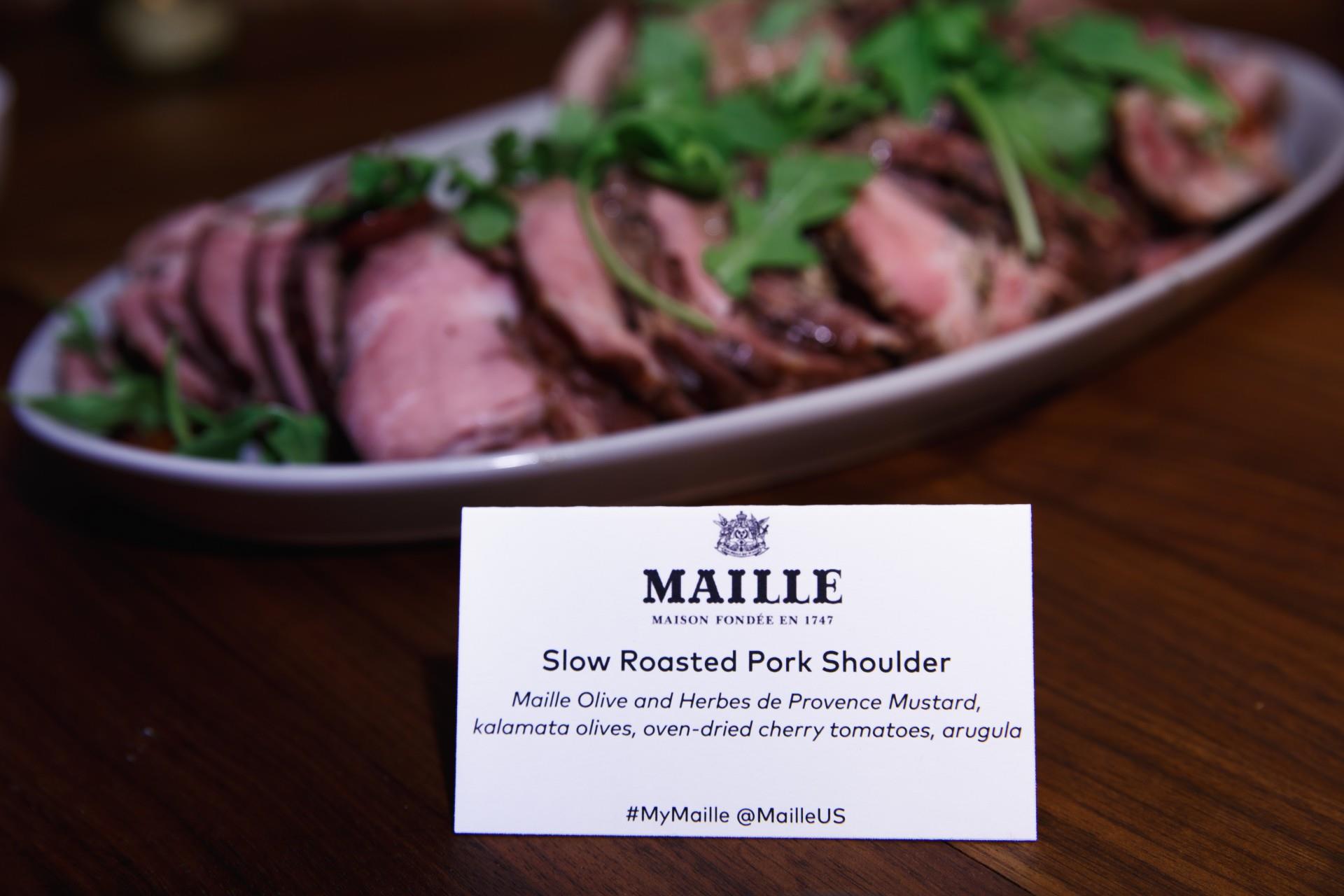 Wait, did I just write that a mustard was used in the cocktails? Yes, and the hints of mustard in both the Maille Punch and Dear Messieurs cocktail were beautifully integrated. The Tasting Table Test Kitchen is a beautiful space suitable for this style event. Arranged on the table were small plates where Maille Mustard’s showcased their versatility with food.