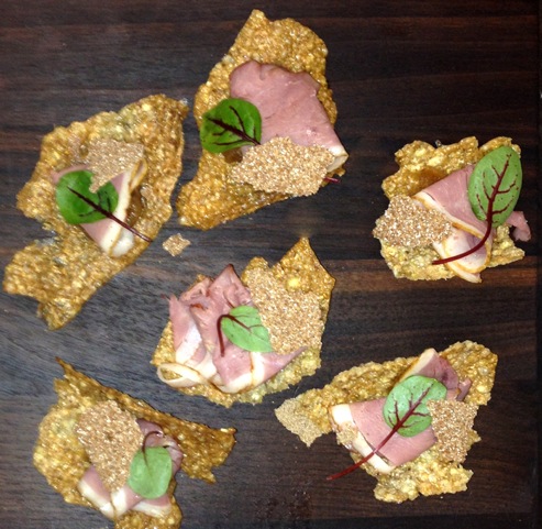 Lightly smoked Duck Breast, served on top of house made Buckwheat Crackers served with Date Confiture and Pickled Mustard Seeds