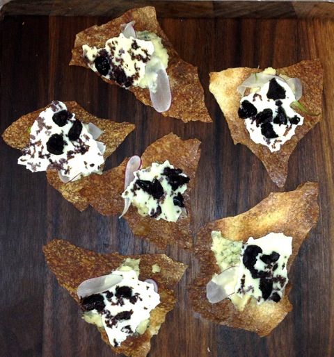 Crispy Lavash topped with domestic Bleu Cheese, Radish slivers, and White Chocolate Tuile with dried Taggiasche Olives