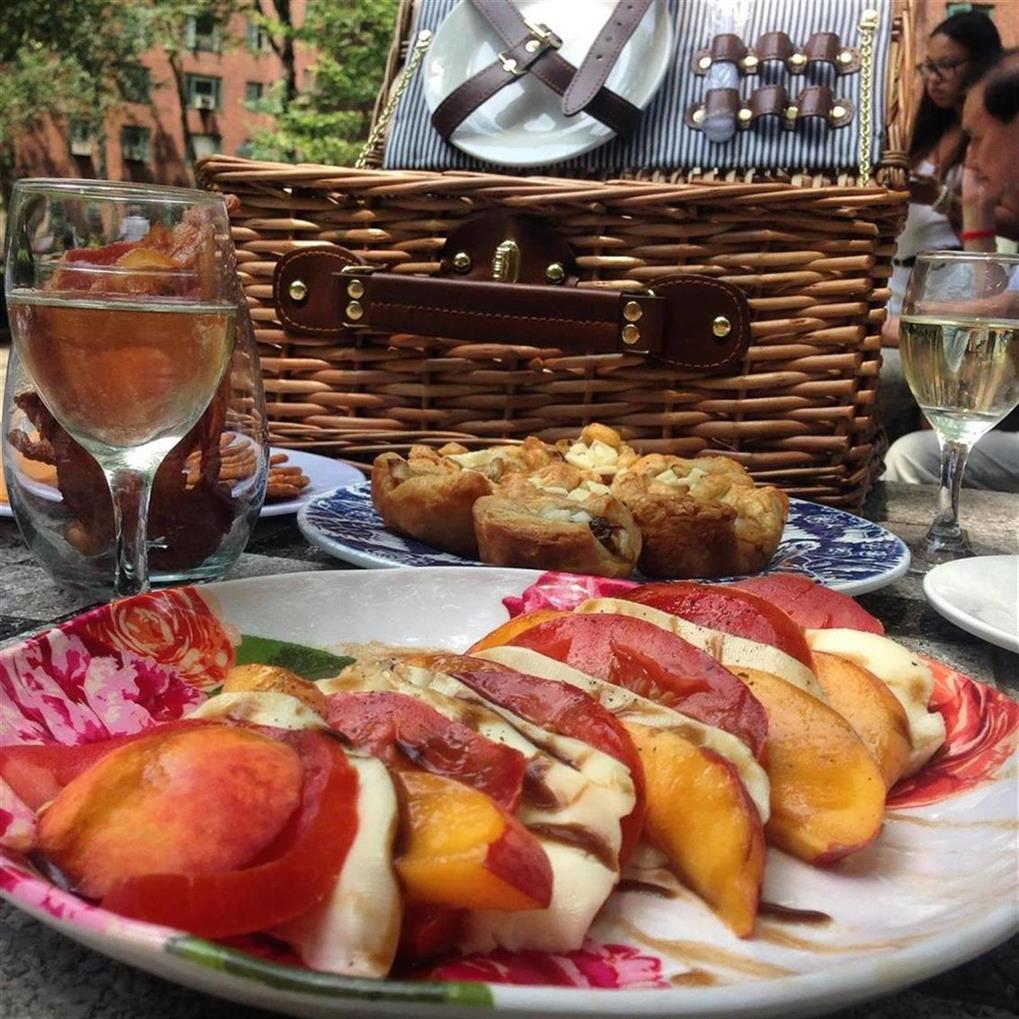 I partnered with True Fabrications which is a wholesale wine accessory company that makes a line of gorgeous picnic baskets( like this one I used for my picnic: Newport Wicker Picnic Basket), wine totes, and cooler picnic totes that you will love. They also make a ton of other fun wine inspired products, perfect for any entertaining at home, outside, etc. I was so excited to grab the chance to snag a picnic basket and partner with True Fabrications because their products are very high quality, great priced, and will make every experience have with them so much more memorable. “Picnic-ing” with my mom in NYC was so much fun and pairing this Rosa Regale with items such as Bacon (instead of a bread basket), Peach Caprese Salad, Onion & Asiago Tartlets, and Lemon Cake & Strawberry Parfaits was delicious. True also makes a line of Mini Mason Jar Shot Glasses (first picture) with covers and small handles.