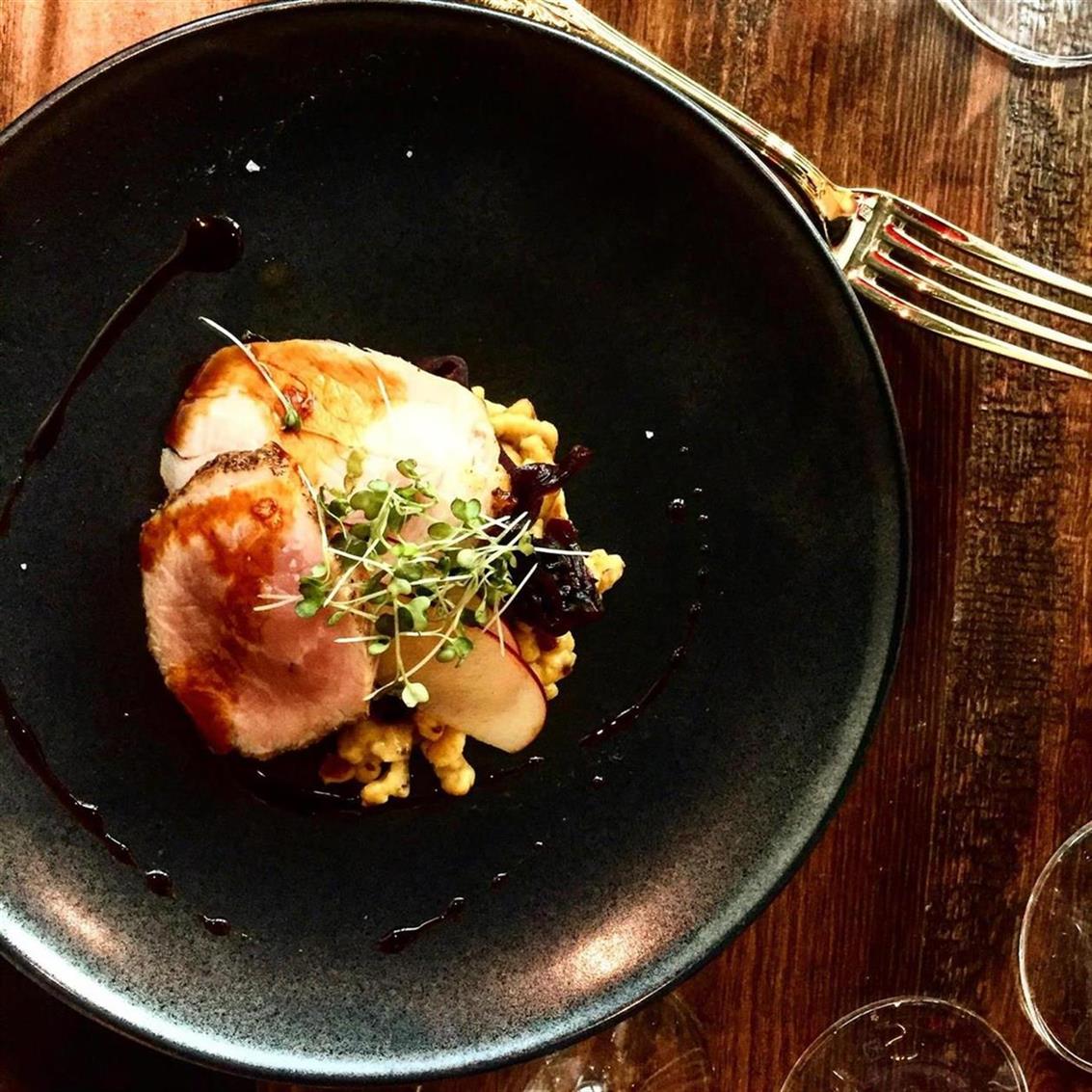 IMG_3897Up next: a 2013 Reserve Marselan and a 2013 Reserve Wild Carignan paired with Gloucester Spot Pork with Red Cabbage, Apples, Baking Spices, and Mustard Spaetzle. I instantly fell in love with the flavor combinations and these red wines! The mustard spaetzle had a bite that paired perfectly with the carignan, while the pork and baking spices were warm, comforting, and winter driven.