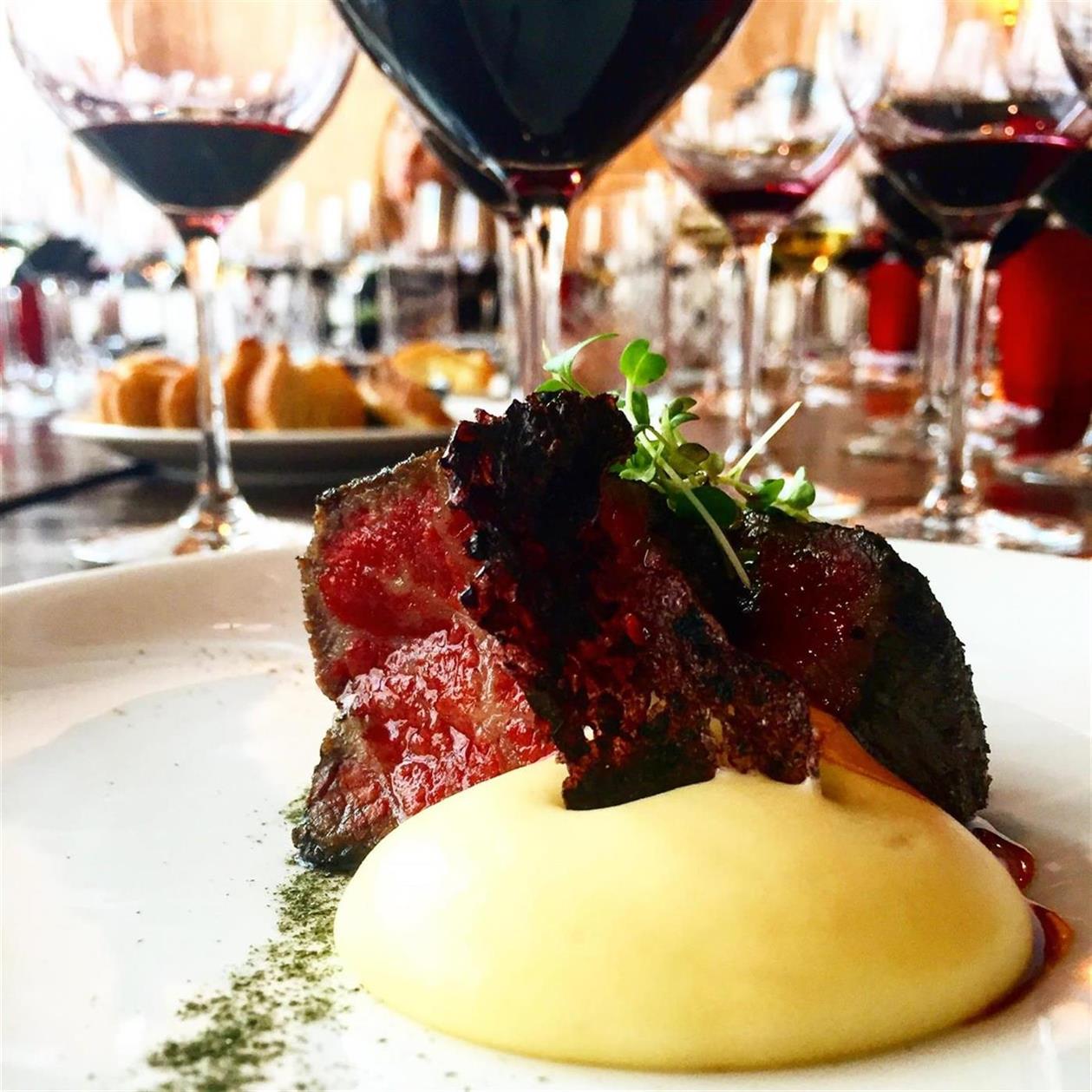 IMG_3898Shortly after Waguy Basses-Côtes arrived at the table and paired with this delicious dish was the 2012 Recanati Special Reserve. This wine is 30% Cabernet Sauvignon, 30% Syrah, 25% Marselan, and 15% Carignan; a beautiful blend with this course. The meat was perfectly cooked, dusted with Nori, and accompanied by Smoked Whipped Potatoes and Forbidden Fried Rice. This wine blend changes annually between Bordeaux and Mediterranean varietals and is matured in 100% new fine-grained French oak barrels for 18 months and then another 10 months in bottle prior to release. I really enjoyed this wine as well, especially with red meat and the smoked potatoes!