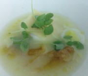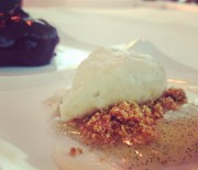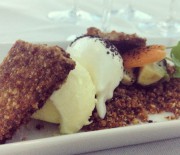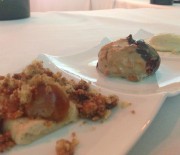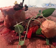 We started off in the cold Winter of Scandinavia, where the scenery may have been snowy, but the food was delightful and comforting. Rye and Bulgur Crisp, Fat, Butter and Ash Malted Wheat Dirt, was placed beautifully on the plate with a side of Pickled Carrots and Brussels. This dish was creamy and delectable and went perfectly with the Tavel, Prieuré de Montézargues, 2013 Rosé. This went great with the crisps, while the minerality in the Costières de Nîmes, Michael Gassier La Petite Ruche, Nostre Païs, 2012 White wine, made the salty Brussels dance on the palate. The second dish, which also went very well with the wines, was the Poached Egg, Parsnip, Nettle Whey, and Farmstead Cheese. This dish was lighter and elegant with just the perfect touch of creaminess.