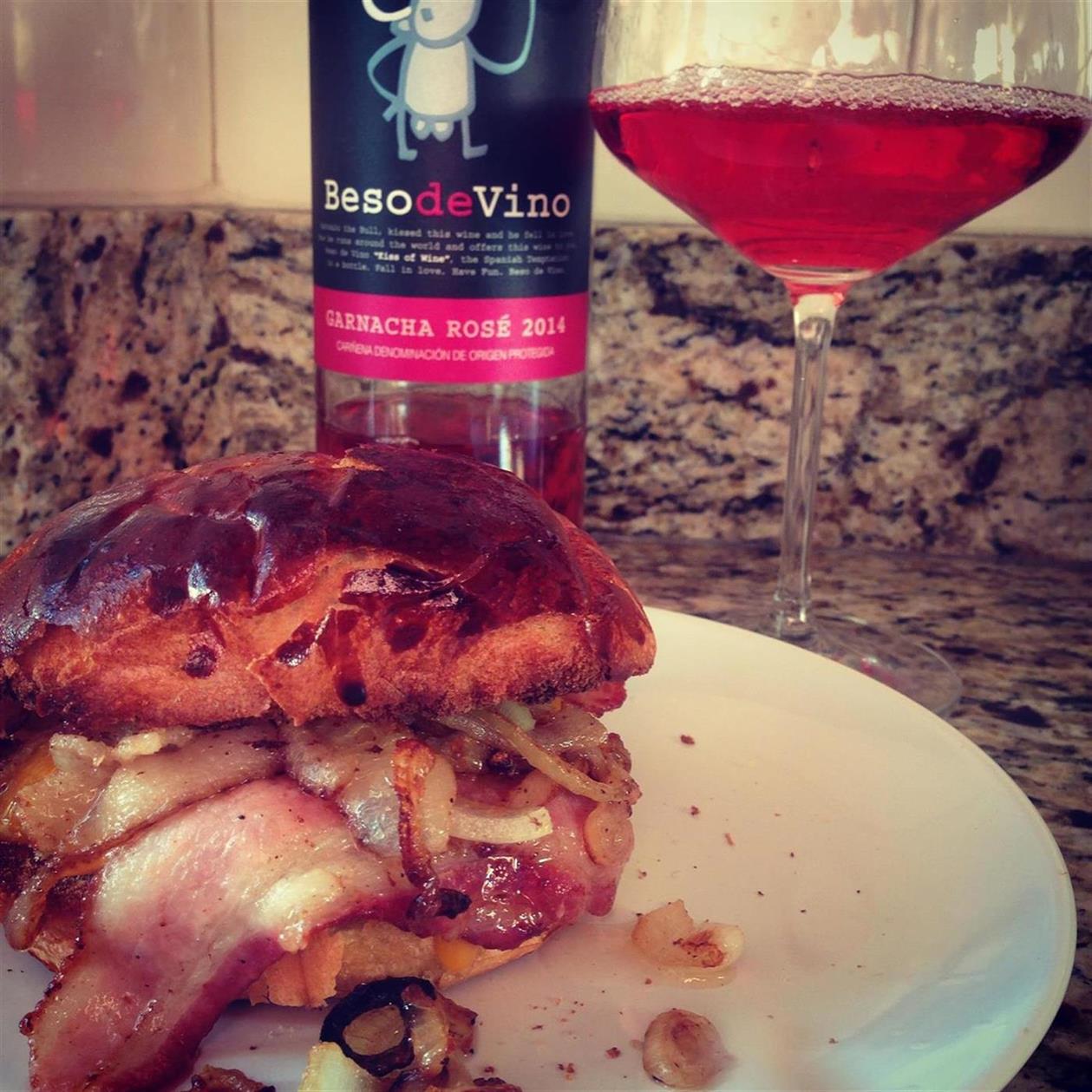 IMG_9452Nothing beats a juicy Bacon Burger with a Spanish Garnacha Rosé! It’s rosé friday and time to unwind with a glass of wine. The Grandes Vinos y Viñedos Beso de Vino Garnacha Rosé 2014 is bright, beautiful, and full of ripe red berries, balanced acidity, and a lot of fun strawberry, violet, and raspberry notes. This wine is “just off-dry” meaning there is a touch of residual sugar felt on the palate. Produced in D.O.P Cariñena, a not so well known but loved wine region for this great grape. The Varietal is 100% Garnacha: a grape varietal known for its fruit forward, mineral driven, and spice driven personality. This bottle runs for around $10.00 retail, so its not a bad buy and perfect for your weekend burger pairings!