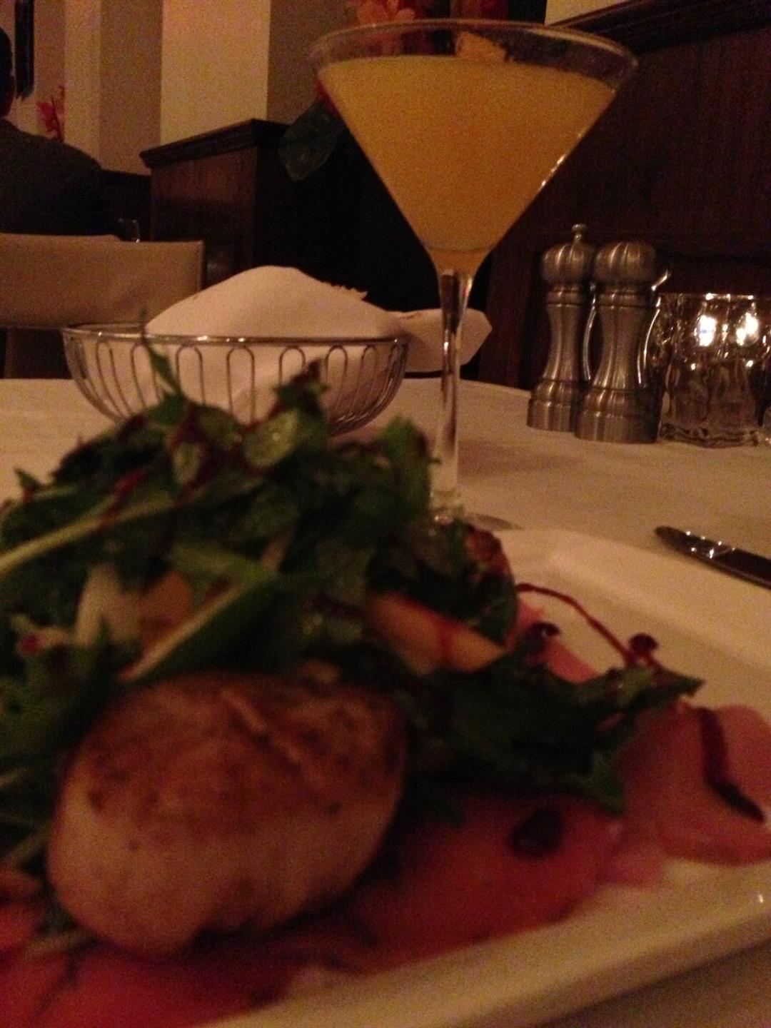 Because I wanted to have a fun pairing dinner, I tried the Love Potion 2 & 1/3 cocktail, which was bright with flavors of Melon, Grey Goose Piore, and Citrus. This fun drink paired perfectly with the Scallop appetizer I had, because the salty prosciutto mixed with the melon and arugula made this cocktail pop with flavor. The meaty, perfectly browned sea scallops, mellowed out the fruit flavors so beautifully that this was a fun, funky, absolutely delicious pairing.
