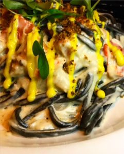 and was accompanied by nicely seasoned french fries. Alongside the steak was another dish that’s out of this world and a must have when dining here. The Squid Ink Pasta with King Crab, Thai Chili, Parmesan, and Cilantro Lime Gremolata is a dish you do not want to miss. It’s colorful, packed with flavor, and worth every single bite!