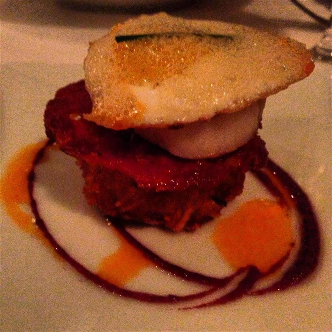 Next came the Scallops Benedict. This dish is creamy, spicy, and packs the perfect punch! The Scallop is laid over a warm, salty, potato pancake, topped with a thin slice of chorizo, a quail egg, and a lobster froth; this one I would say is a very sexy dish!