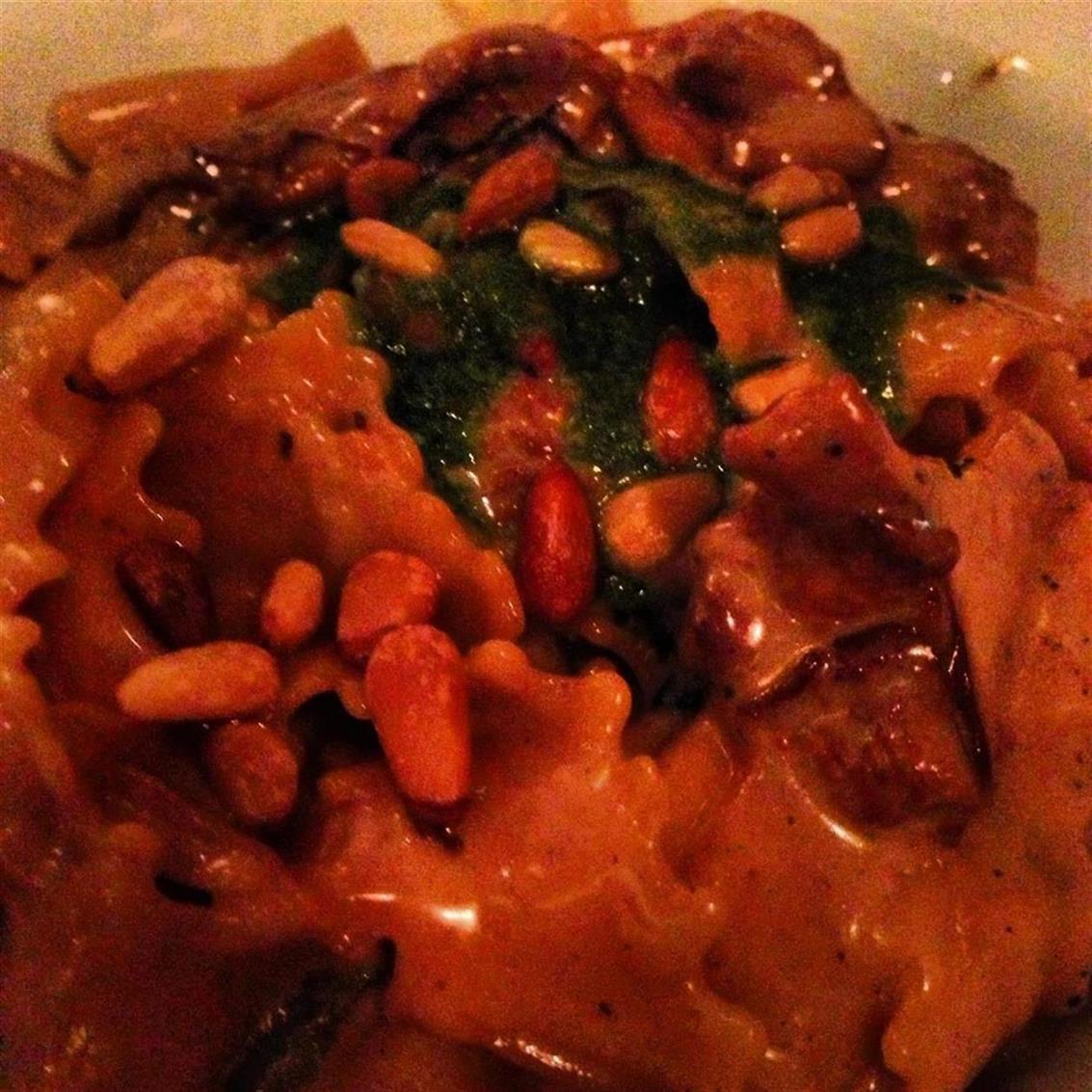 - Fresh Cut Pumpkin Pasta with arugula pesto, chanterelle mushrooms and Parmesan cheese.