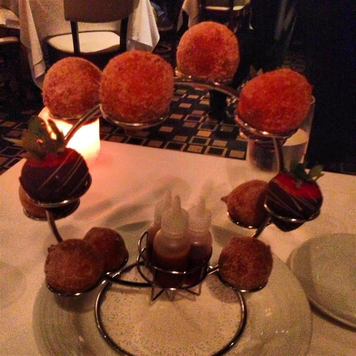 As if I could possibly fit any more into my stomach… I did. The Drunken Doughnuts are an absolute must have when you dine at this restaurant. Freshly fried doughnut holes, coated in cinnamon and sugar, come arranged on a Ferris wheel looking holder and are accompanied by Strawberry Daiquiri, Salted Caramel, and Godiva Chocolate Liqueur sauces. This dish is creative, delicious, and left me speechless.
