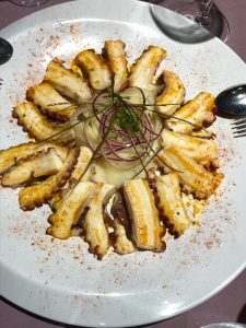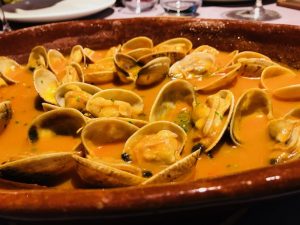 The first day I arrived we stayed in the beautiful city of A Coruña. This is a port city on a point in the Galicia region of northwest Spain. It’s known for its Roman lighthouse, the Tower of Hercules, which has sweeping coastal views. I had the pleasure of going up in the tower and witnessing all of the beautiful views of A Coruña; it’s simply stunning. The food in Galicia is very good and you will find a lot of pork and seafood in this region. We had lunch at La Sartén de Coruña where I enjoyed an array of different shared plates with three other wonderful wine writers from NYC and Brazil! We started off with the La Sartén octopus, which comes grilled and is served with boiled potatoes and onion. The portions are large enough for sharing and everything is very fresh and delicious. After the octopus came the steamed clams in a wonderful red sauce. We, of course, paired every course with a bottle of Albariño, which is the most well known white wine from this region of Spain. Now, because fish is very big here, it was only proper that our first lunch was a giant platter full of grilled fish. All of these dishes you will find on the Special House Menu here at La Sartén de Coruña.