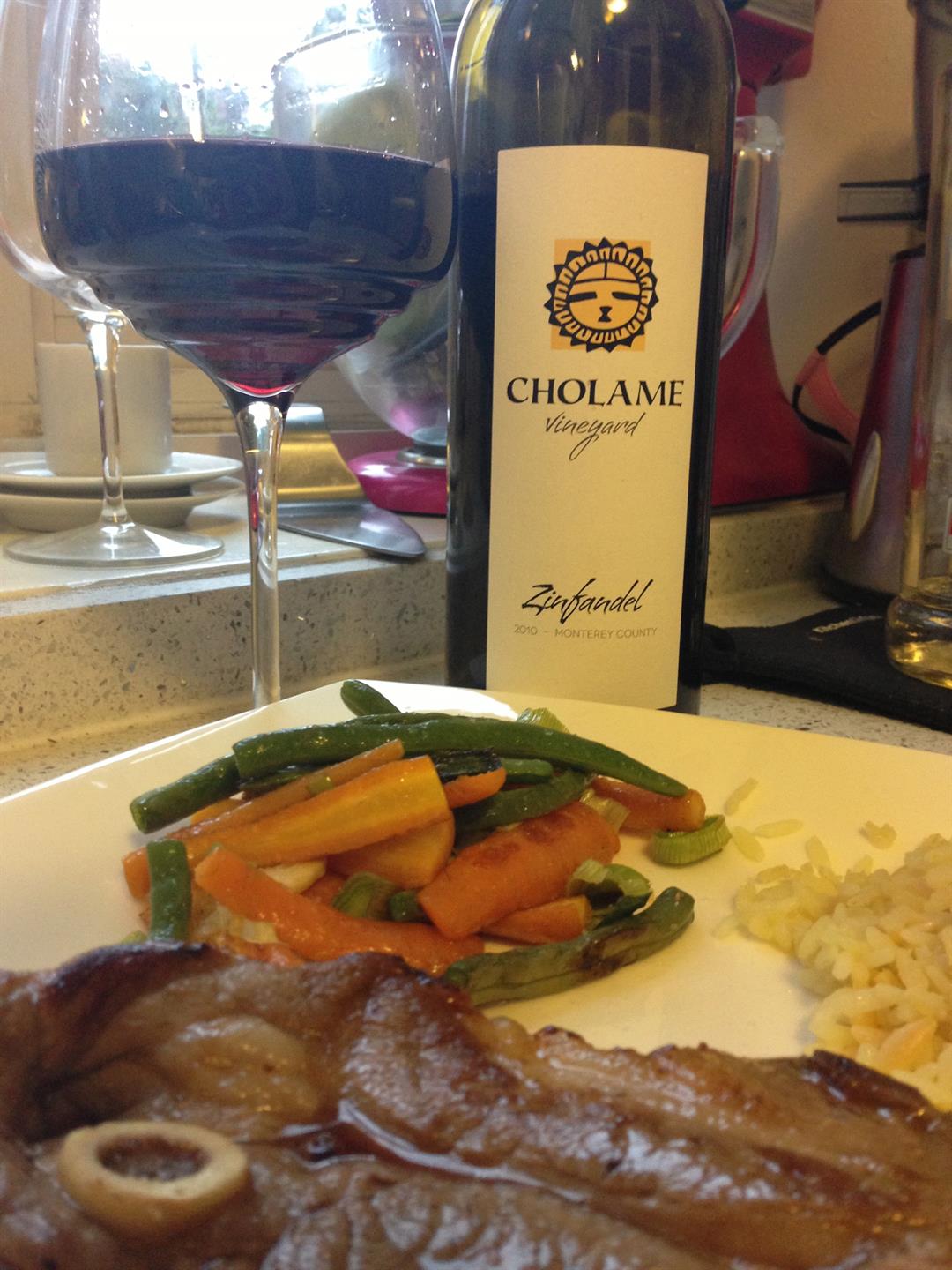 IMG_1784      The 2010 Cholame Zinfandel, is a wine I realized I wanted to decant once the aromas didn’t jump out of the glass. This wine decanted for about 10 minutes and showed me a side that I knew it would once it had a little breather room. For a big spicy wine I tend to want to pair it with a meat that has a slightly sweeter side, so I chose Lamb Shoulder. IMG_1783The fat in the cut of meat makes for a beautiful flavor and is great for a bigger wine. Lamb tends to be a sweeter flavored meat, with a lot of punch, so a simple salt and pepper rub down was all this needed. The Zinfandel was full of black pepper, plums, and currants. On the palate the fruit shined once decanted, but leaves you with a finish of chocolate, some slight tobacco, and when tasted with the lamb, it was simply beautiful. This wine is a fun one, as the longer it breathes, the more beautiful it becomes! At 15% alcohol, this wine surprisingly doesn’t pack as much heat as one would think… which means, it’s certainly a well-balanced wine!