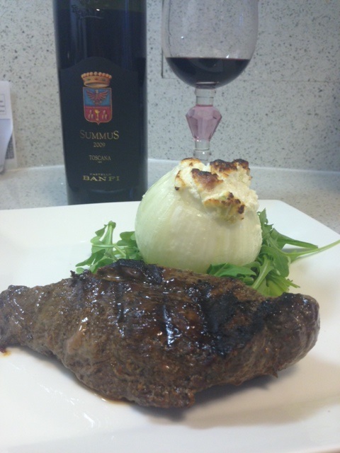For dinner, I paired with my lovely Summus with Steak, and a Goat Cheese, Garlic, and Prosciutto stuffed Vidalia Onion over a bed of Baby Arugula. I saw a recipe for a Blue Cheese stuffed bacon onion on Pinterest, but since I love to improvise it worked out to my benefit. The steak is simple; I marinated it in worcestershire sauce, garlic, salt, and pepper… threw it on the grill, and Voila!